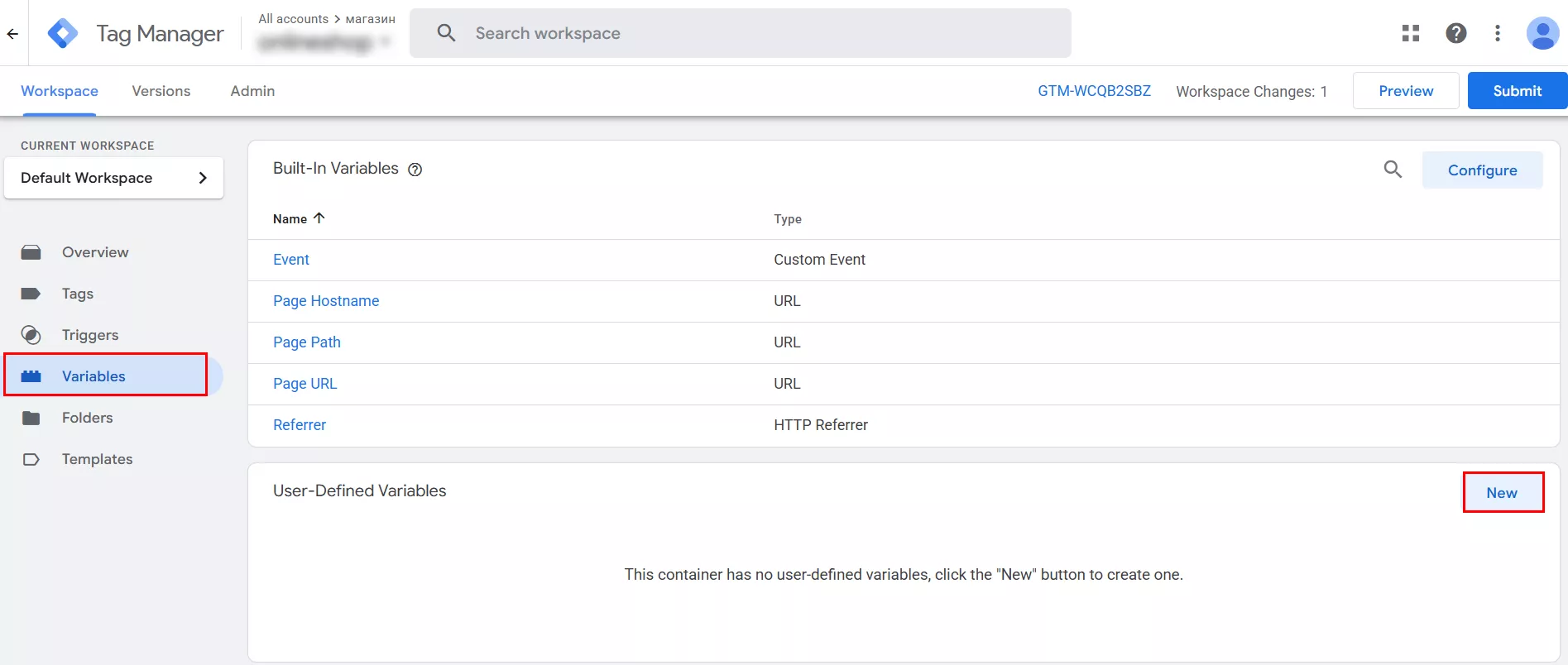 Отидете в раздел „Variables“ и натиснете бутона „New“.