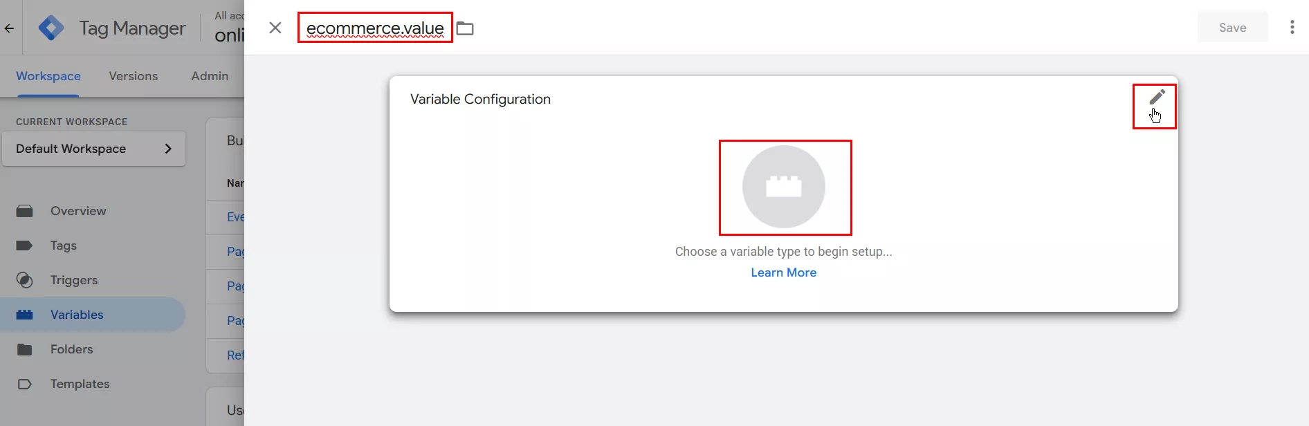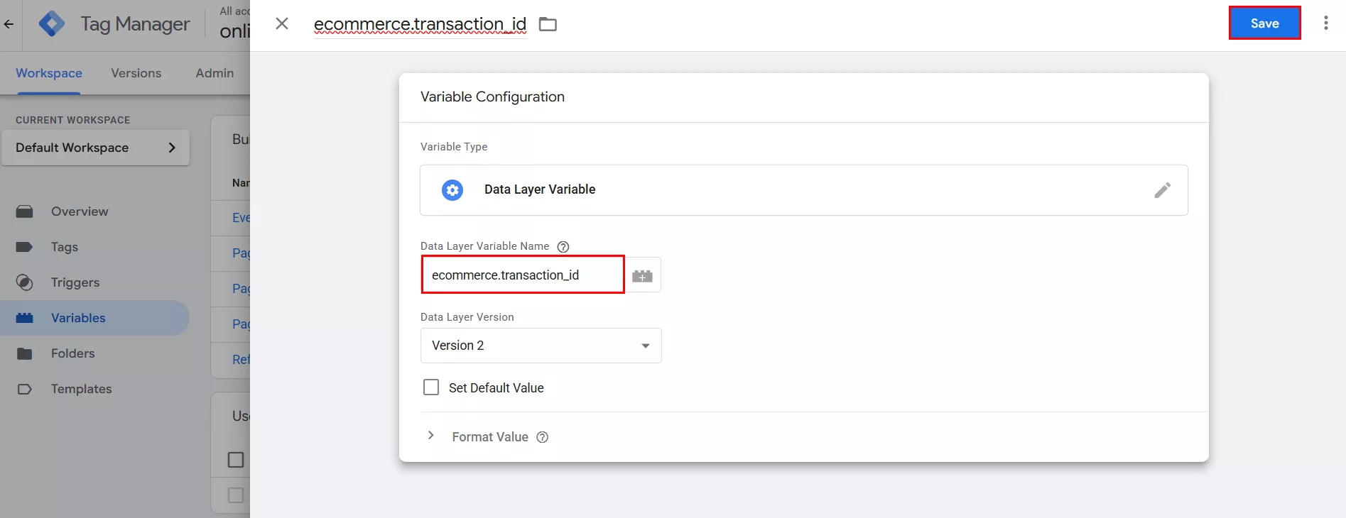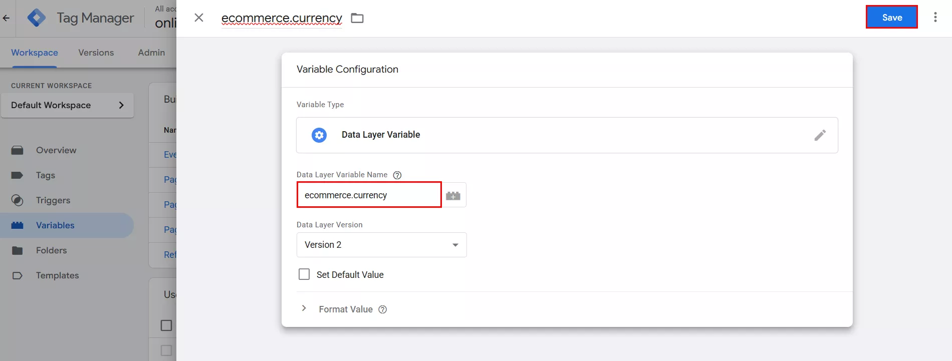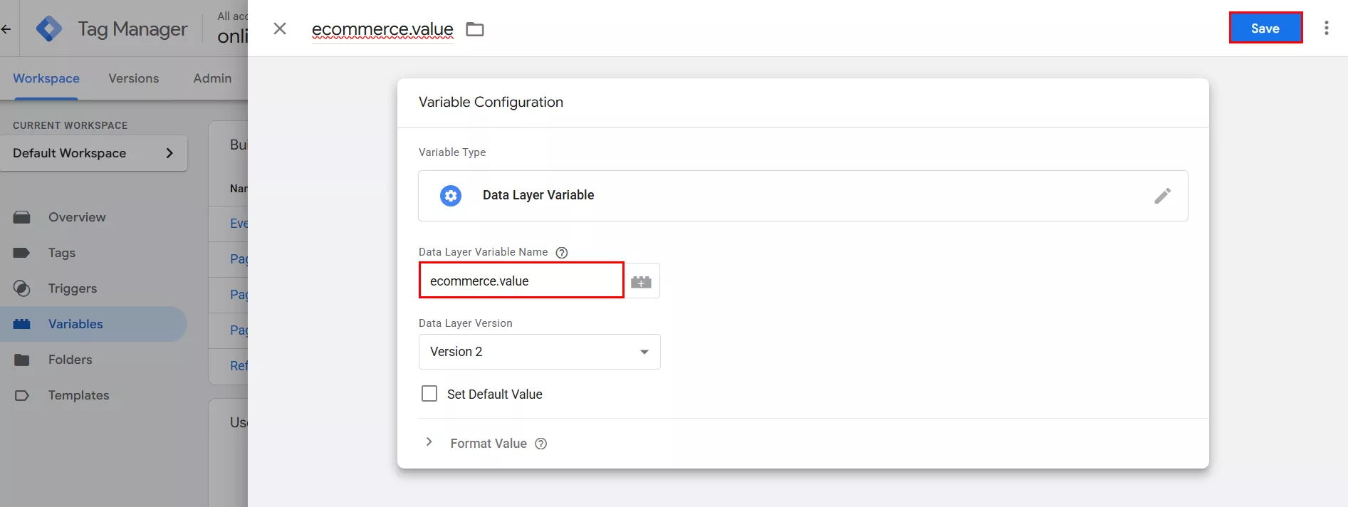 В полето „Data Layer Variable Name“ въведете ключа ecommerce.value – в него се съхранява информацията за стойността на транзакцията. Натиснете „Save“.