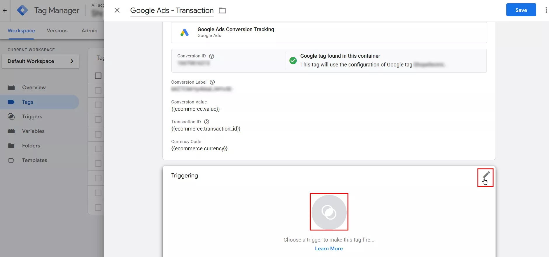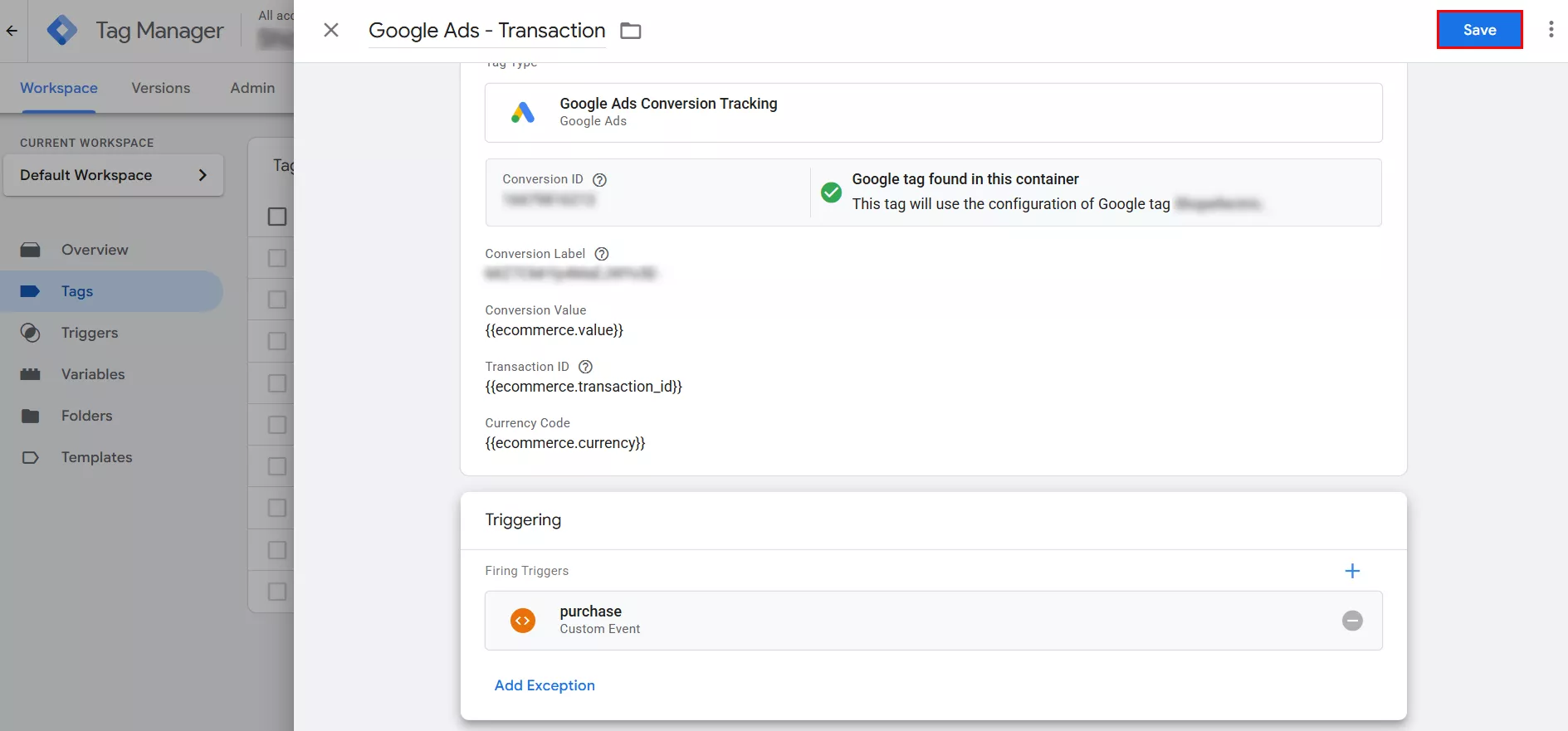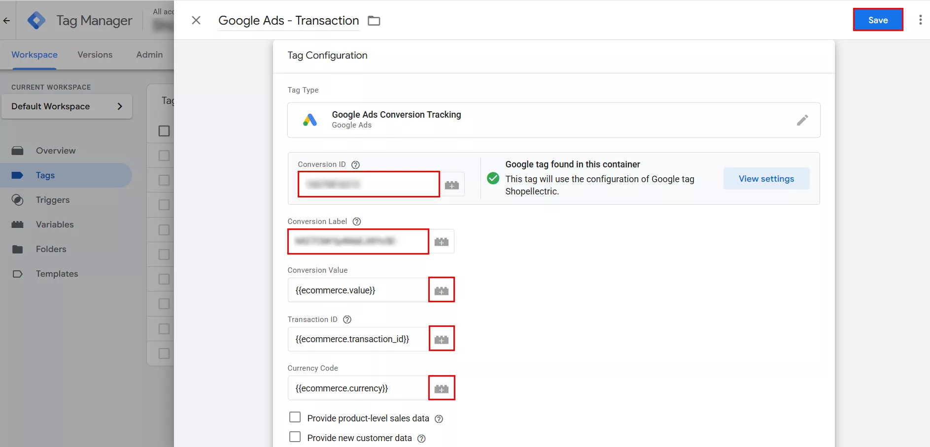 В полетата Conversion ID и Conversion Label въведете съответните стойности, които сте получили при създаването на конверсията в Google Ads. В полетата Conversion Value, Transaction ID и Currency Code изберете от списъка съответните променливи, които създадохте по-рано. Натиснете „Save“.