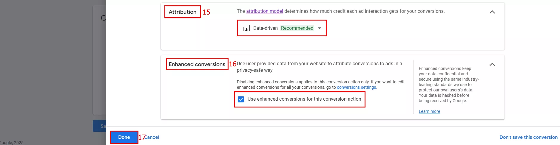 В полето „Атрибуция“ по подразбиране се използва атрибуция, базирана на данни (Data-driven). Това е най-съвременният модел, който автоматично разпределя стойността на конверсията между всички точки на контакт на потребителя с вашата реклама – въз основа на реални данни за поведението. При необходимост можете да смените модела на атрибуция на Last click – когато цялата стойност на конверсията се присвоява от последната реклама, с която потребителят е взаимодействал. Допълнителна информация за моделите на атрибуция ще намерите в помощната документация на Google.