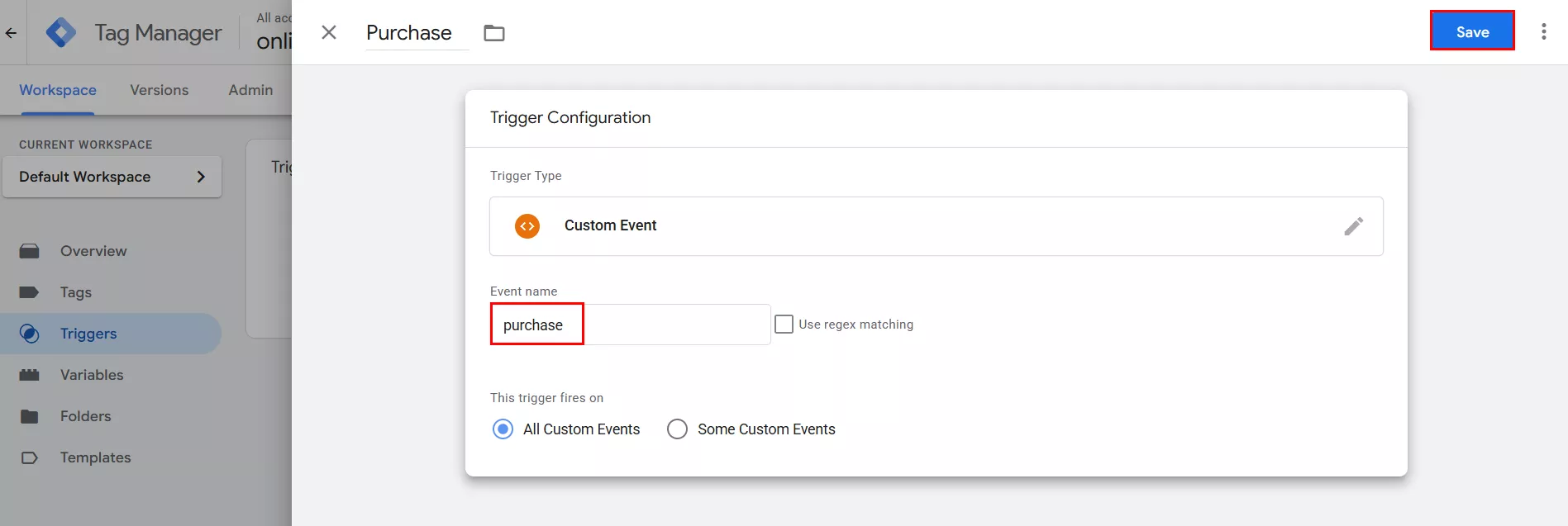 В полето „Event name“ въведете purchase – това е събитието, което трябва да се предава в dataLayer след успешно завършване на поръчка. Натиснете „Save“. Това означава, че тагът за конверсии ще се активира в момента, в който сайтът регистрира събитие за покупка и го изпрати към GTM.