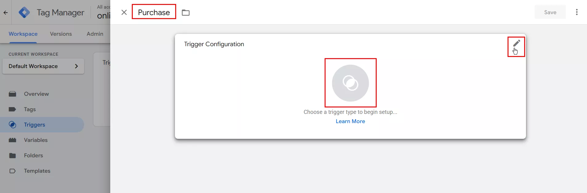 След това трябва да добавите тригера за покупка. Кликнете върху иконата за редакция или в центъра на блока „Triggering“, за да изберете тип тригер.