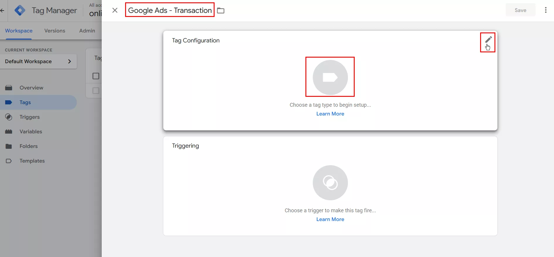 Преименувайте тага, за да бъде лесно разпознаваем, след което кликнете върху иконата за редакция или в центъра на блока „Tag Configuration“, за да изберете типа на тага.