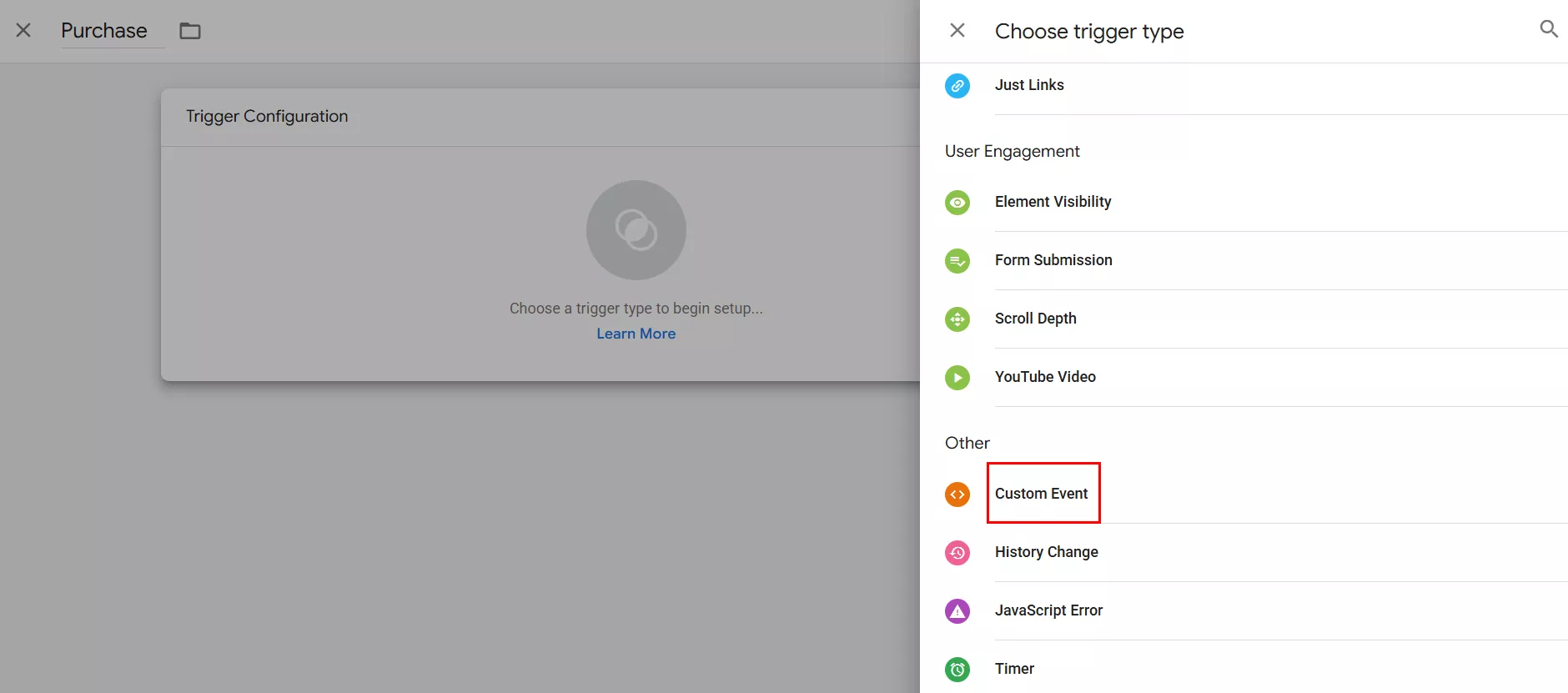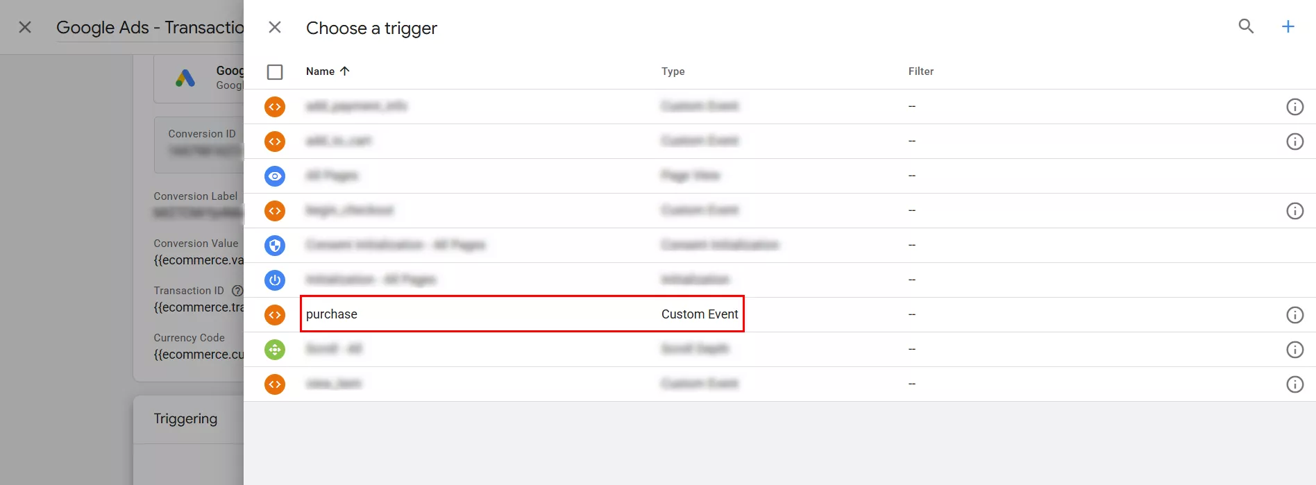 - създайте тригер от типа „Custom Event”, който ще се задейства в момента на реалната конверсия (например purchase);