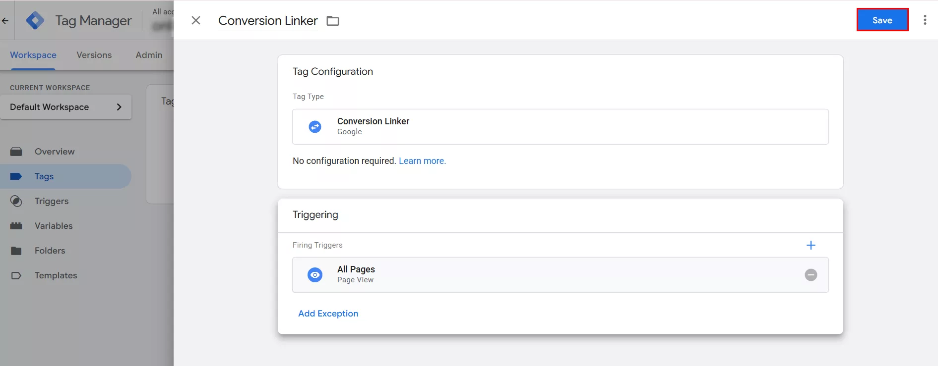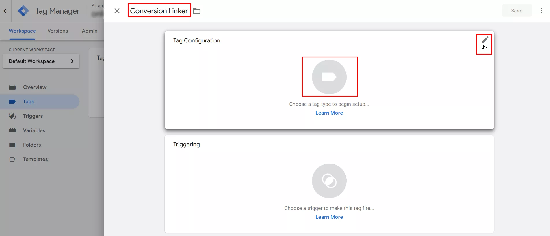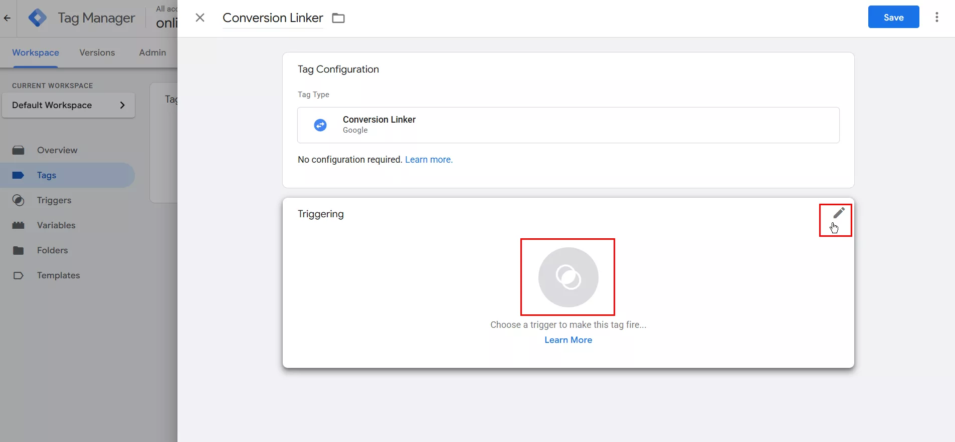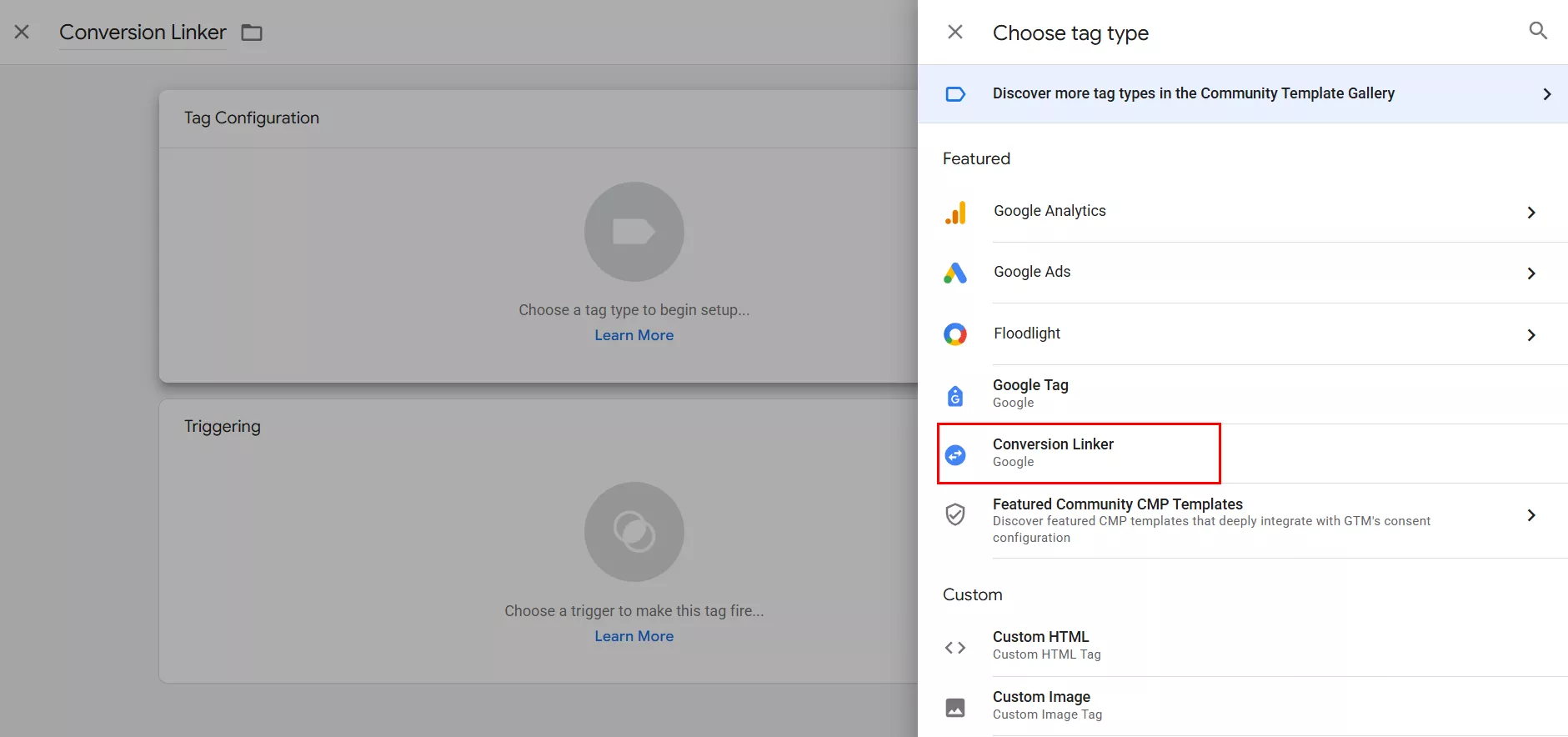 Първо се уверете, че в контейнера ви в GTM е настроен таг за свързване на конверсии (Conversion Linker). Той е необходим за правилното предаване на информация за кликванията от рекламите в Google Ads (например параметъра gclid) и за последващото отчитане на конверсии.