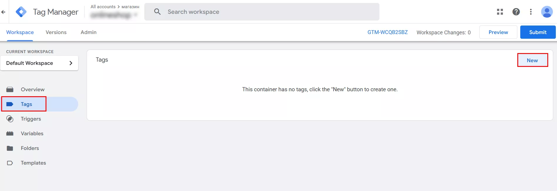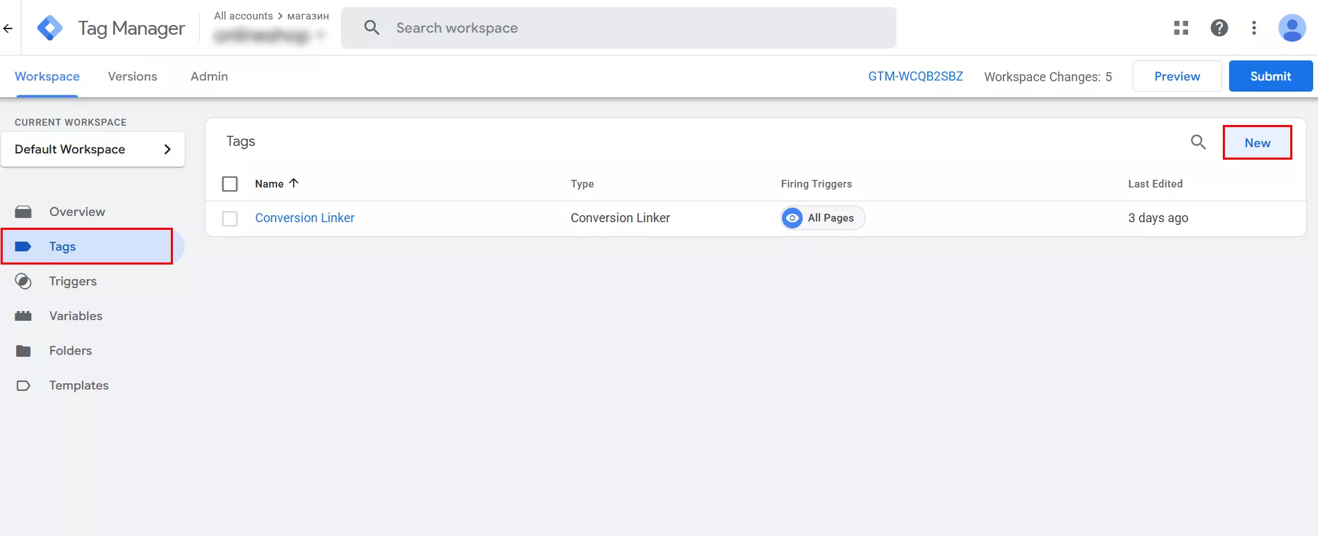 Отидете в раздел „Tags“ и натиснете бутона „New“.