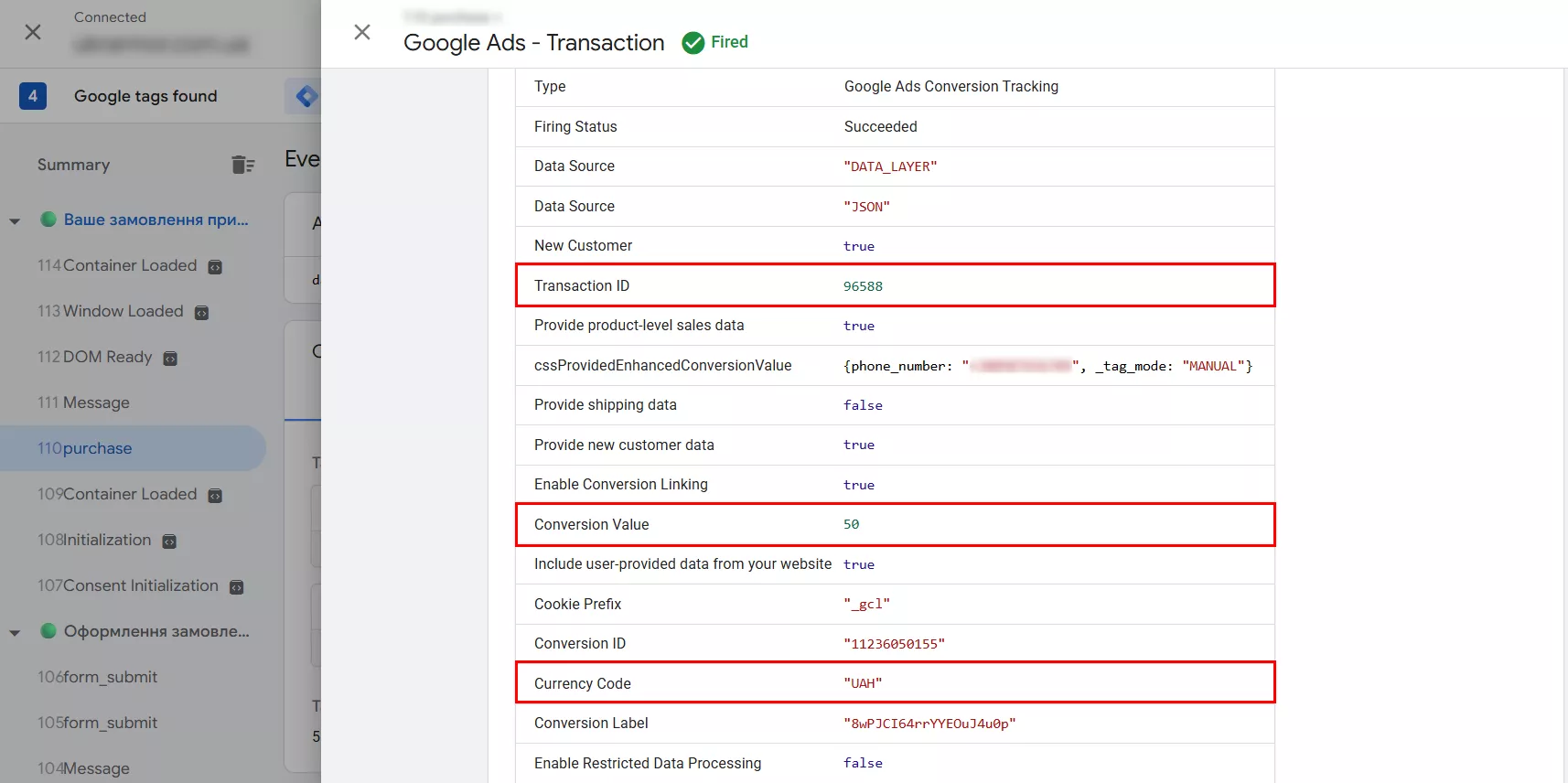 Кликнете върху тага за конверсии в панела за предварителен преглед, за да видите неговите детайли. В секцията „Параметри на тага“ проверете дали успешно са предадени стойностите от променливите: ecommerce.value, ecommerce.currency и ecommerce.transaction_id. Ако всички данни се показват коректно – тагът е настроен правилно и е готов за публикуване.