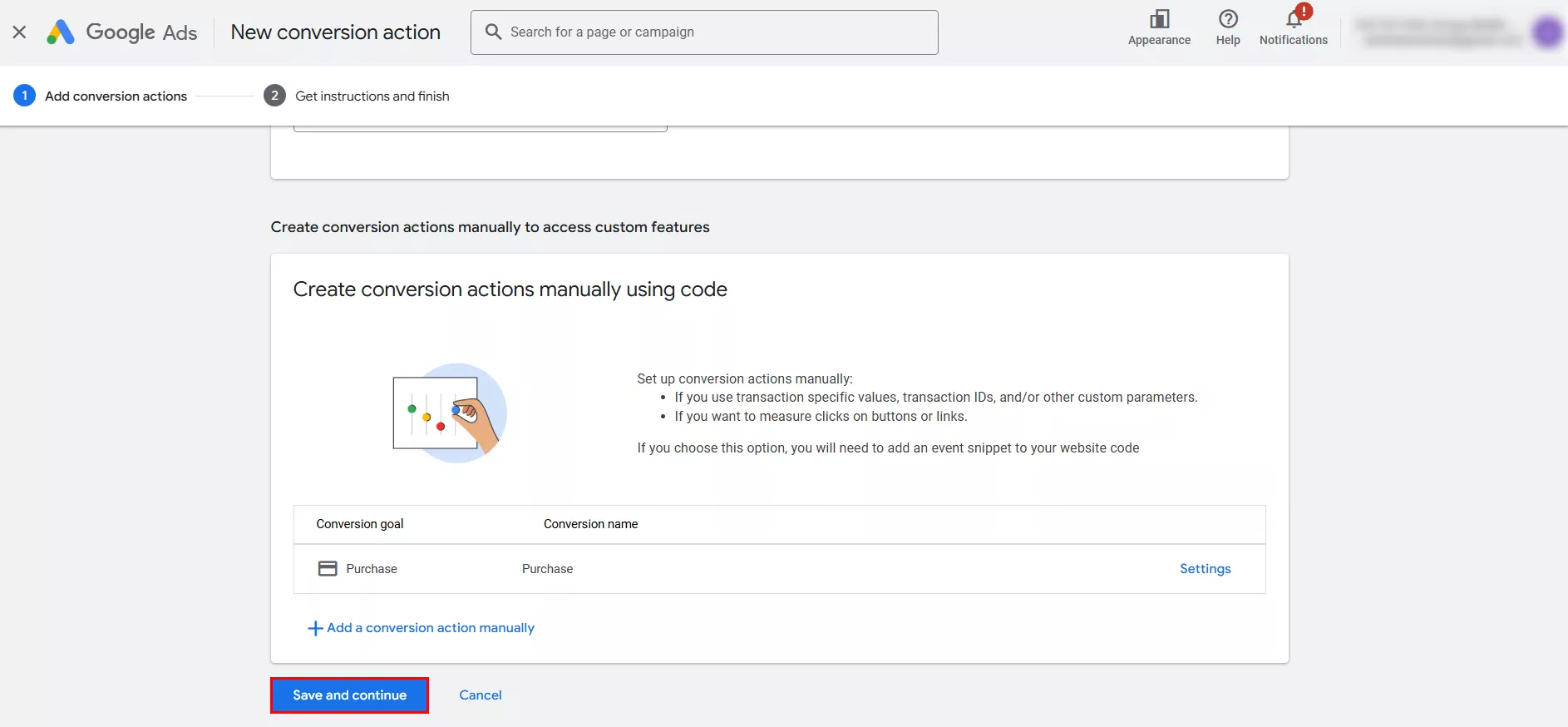 След създаването на конверсията ще се отвори страница с нейните параметри и новата цел. Натиснете „Запази и продължи“, за да преминете към етапа на внедряване на тага.