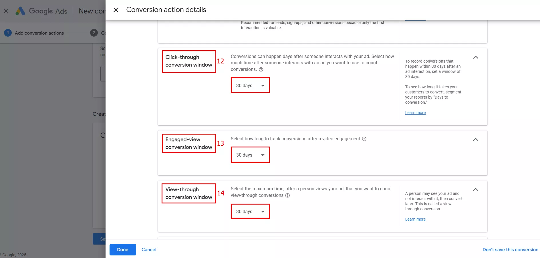 Ако активирате „Разширено отчитане на конверсии“, посочете в какъв период след показването на рекламата, но без клик върху нея, може да се отчете конверсията.