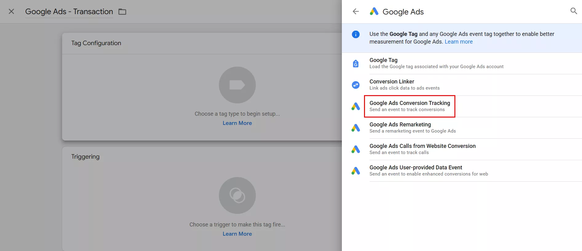 Изберете „Google Ads“, след това „Google Ads Conversion Tracking“.