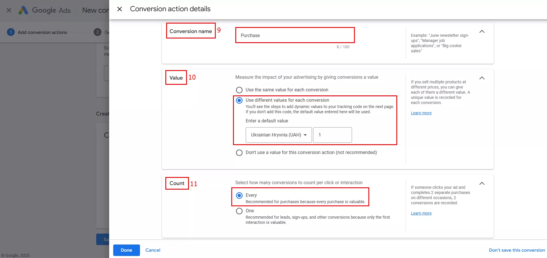 Настройте стойността (value) на конверсията – фиксирана, динамична или без стойност.