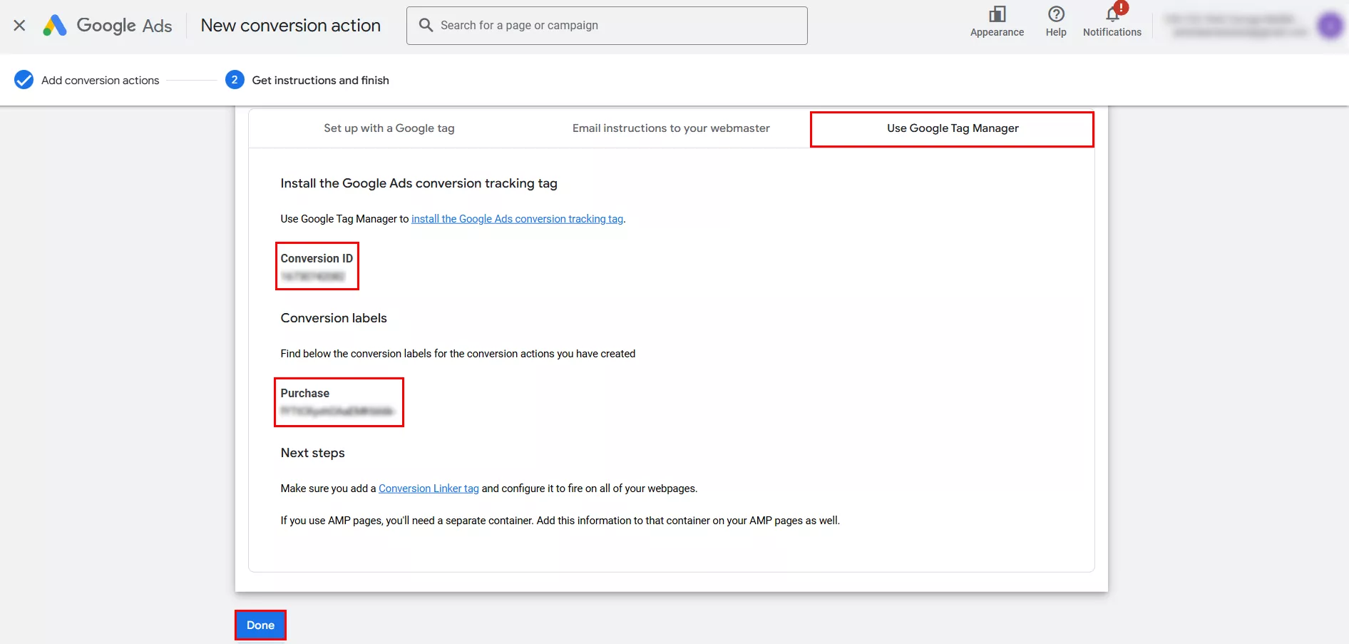На следващия етап ще се отвори страница с три варианта за внедряване на тага за конверсии. Тъй като в тази статия се разглежда настройката чрез Google Tag Manager, изберете раздела „Google Tag Manager“, за да получите необходимите параметри.