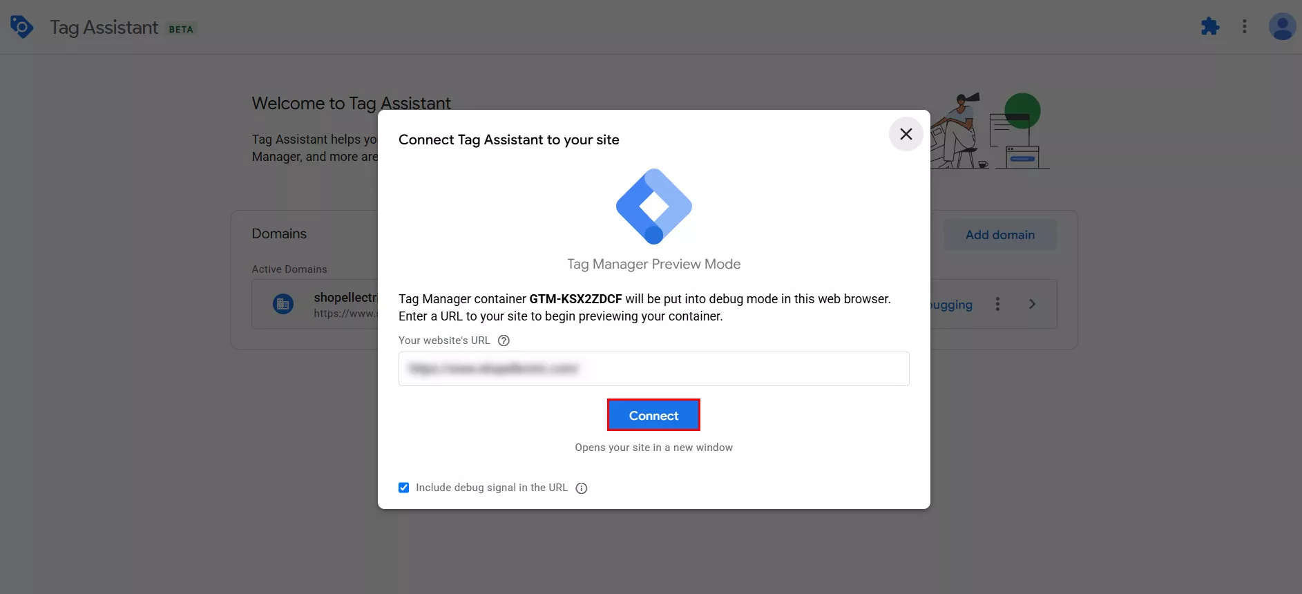 В изскачащия прозорец въведете URL адреса на страницата на своя сайт и натиснете „Connect“.