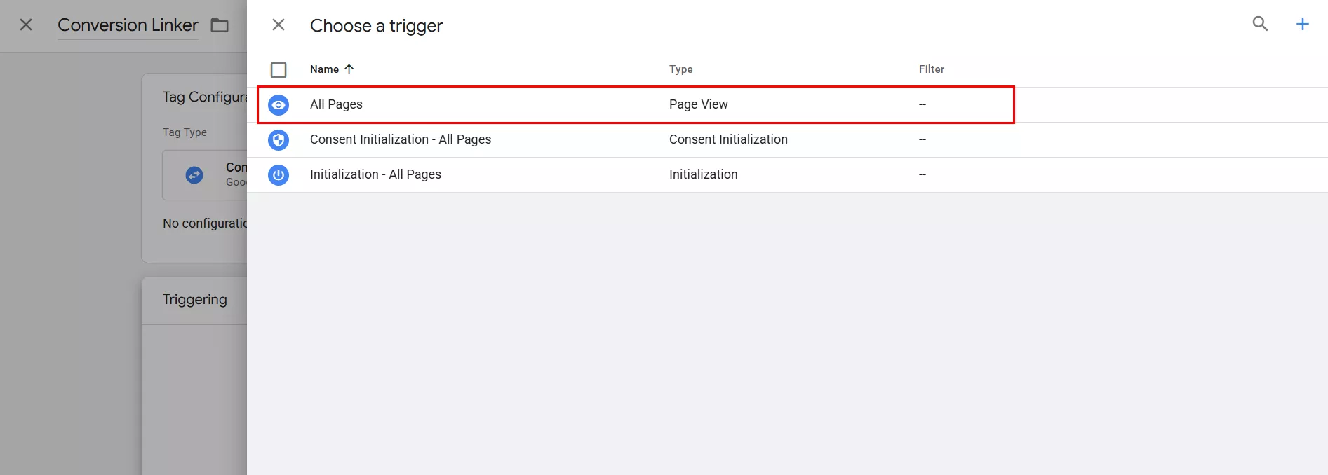 Тригерът определя при кое събитие или на коя страница трябва да се задейства тагът за конверсии, например след зареждане на страница „Благодарим за покупката“.
