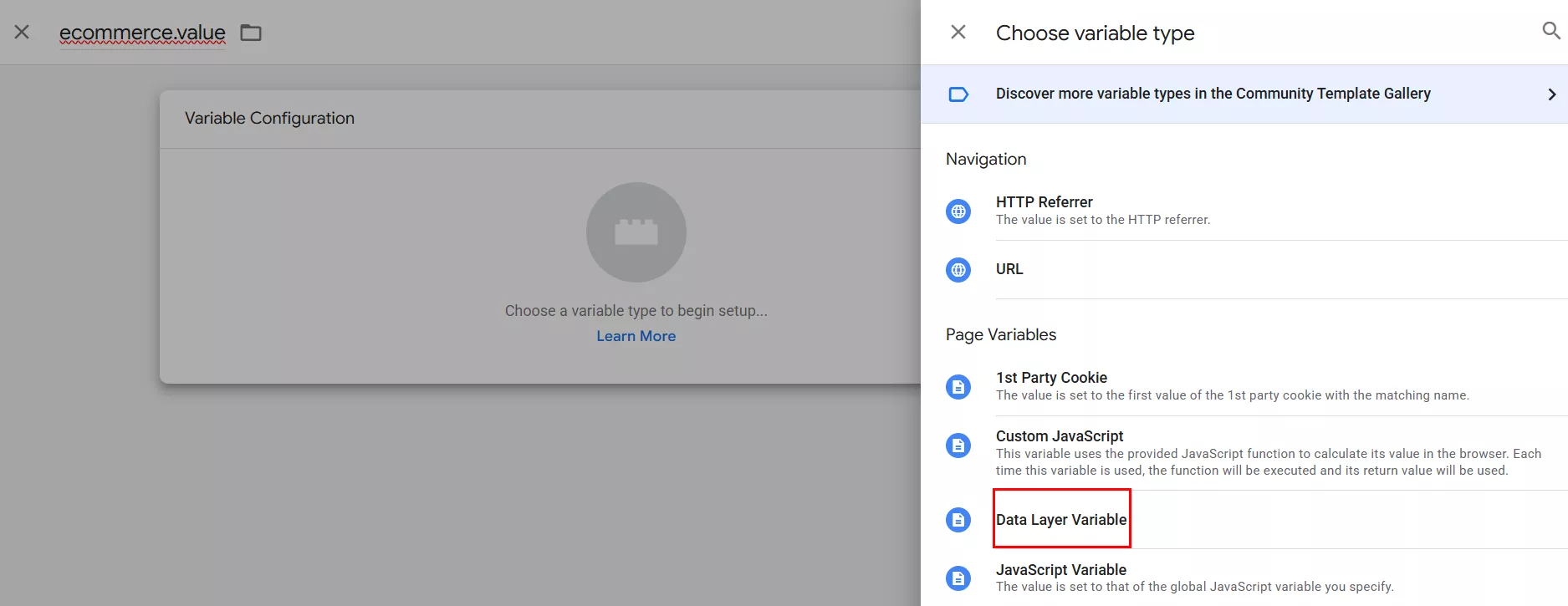 За да предадете динамичната стойност на конверсията (сумата на покупката), е необходимо да създадете променлива от типа Data Layer Variable – тя ще позволи да се извлече стойността, която сайтът предава чрез dataLayer.
