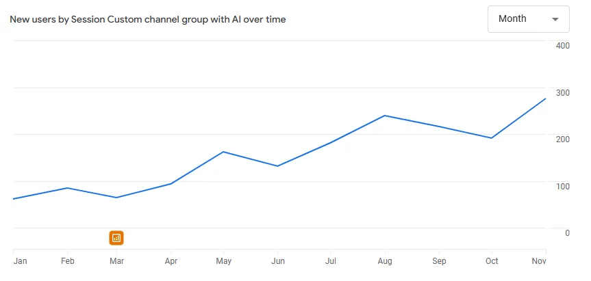 За да не остане темата в зоната на мнения и “усещания”, целта беше AI видимостта да бъде измерена като реален канал, подобно на Organic, Paid, Referral. Използвахме GA4 с групиране на AI трафика и следяхме развитието по месеци, не на дневна база, защото AI каналът има натрупващ ефект.