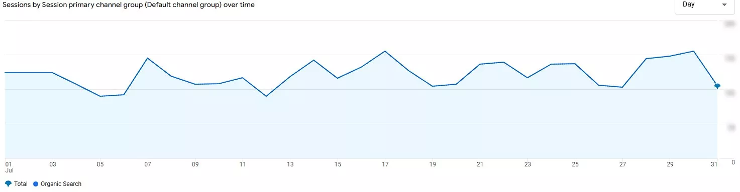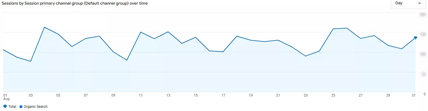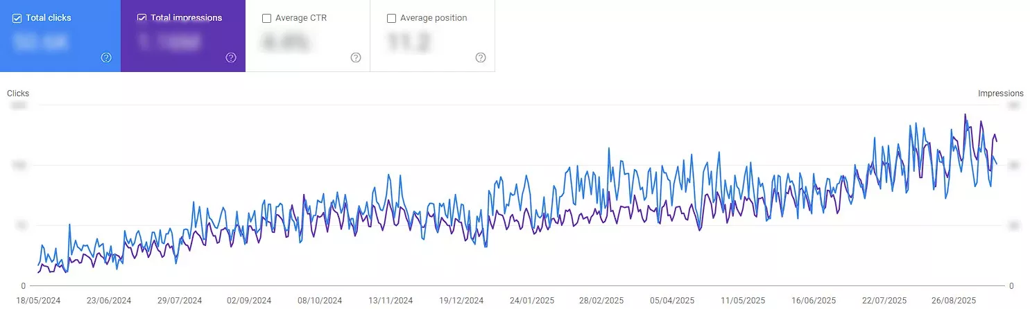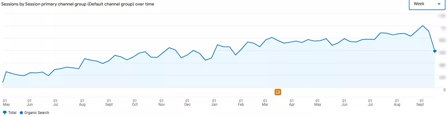 На графиката се вижда как от последните данни преди 16 месеца (05.2024) всеки месец има ръст в органичния трафик към сайта до днес (09.2025).